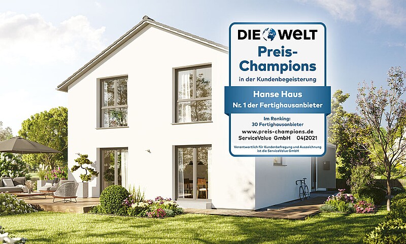 Hanse Haus wurde im April 2021 von ServiceValue und DIE WELT als "Preis-Champion" ausgezeichnet. Bereits zum dritten Mal in Folge konnte Hanse Haus mit der Preisgestaltung am stärksten überzeugen und belegt den ersten Platz in der Kategorie der Fertighausanbieter.