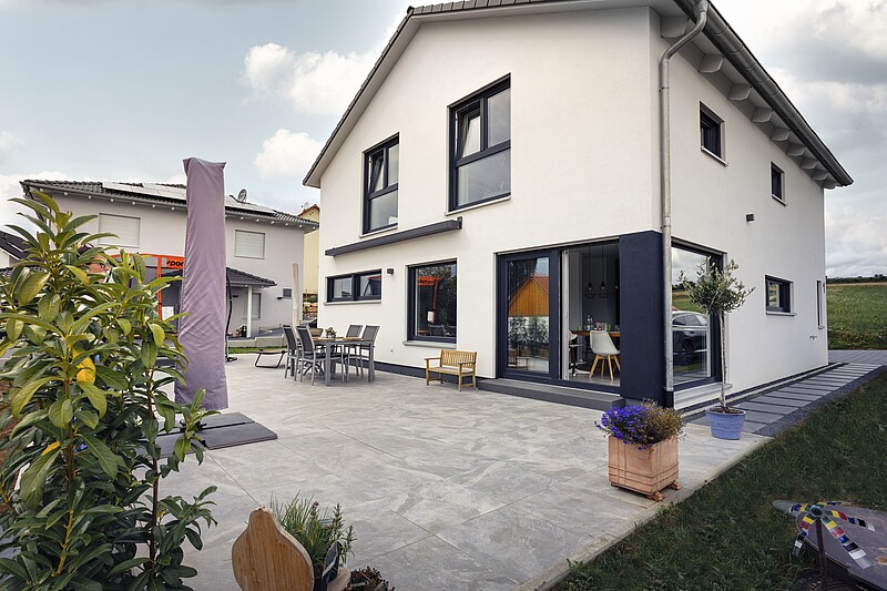 Unsere Bauherrenfamilie Trabert aus Ostheim vor der Rhön hat 2021 gemeinsam mit Hanse Haus ein modernes, freistehendes Einfamilienhaus mit flachem Satteldach gebaut.