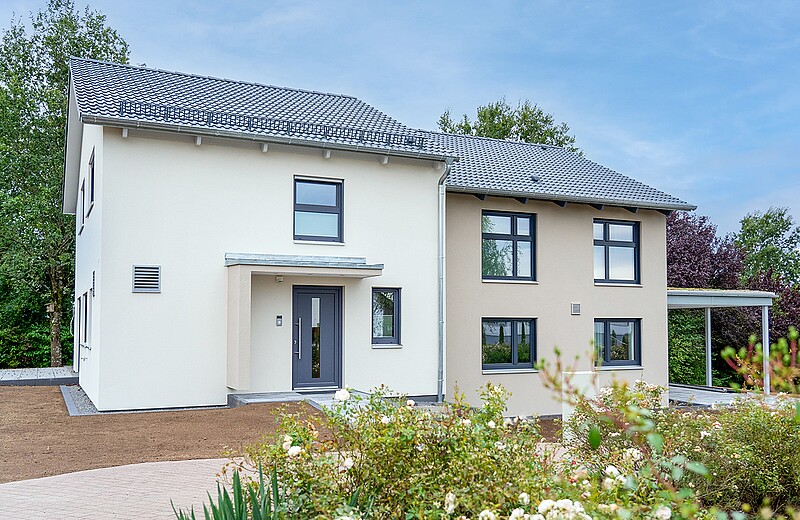 Die beiden Häuser unterscheiden sich nicht nur im Innenbereich, sondern auch äußerlich: Die rechte Haushälfte ist mit einem Carport, der gleichzeitig als Hauseingangsüberdachung dient, versehen, während die linke Haushälfte ein L-Vordach bietet. Die Fenster beider Häuser sind in zwei verschiedenen Grautönen gehalten: Basaltgrau und Schiefergrau, passend zu den in dunkelgrau gehaltenen Dächern. Die Putzfarbe der linken Haushälfte ist ein helles Beige, während die rechte Haushälfte in einem kräftigen Beigeton gestaltet wurde.