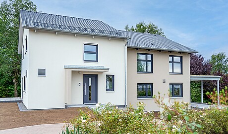 Beide Häuser sind mit einem 25°-Satteldach ausgestattet, das für Photovoltaikanlagen geeignet ist. Der Kniestock des linken Hauses ist 2 m hoch, wie es für das Kataloghaus Doppelhaus 25-125 üblich ist. Damit sind 75 cm hohe Fenster im Kniestock möglich, die eine Brüstungshöhe von etwa 60 cm aufweisen. Diese Fenster können aufgrund der niedrigeren Brüstung nur gekippt werden. In der rechten Haushälfte, die einen Kniestock von 2,30 m hat, haben die Fenster eine Brüstungshöhe von 90 cm, was sie vollständig öffenbar macht. Diese clever durchdachten Details sorgen nicht nur für optimale Lichtverhältnisse, sondern auch für hohen Wohnkomfort.