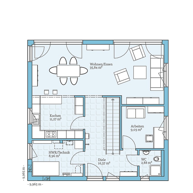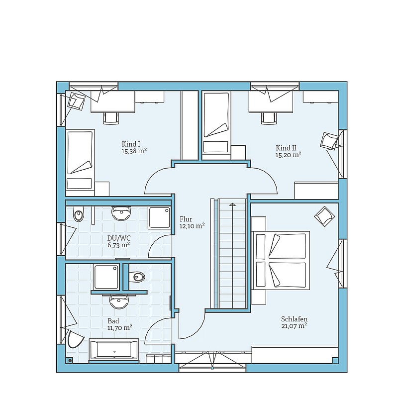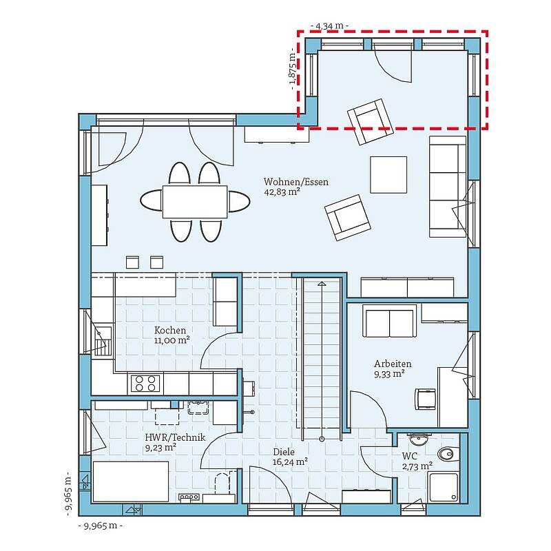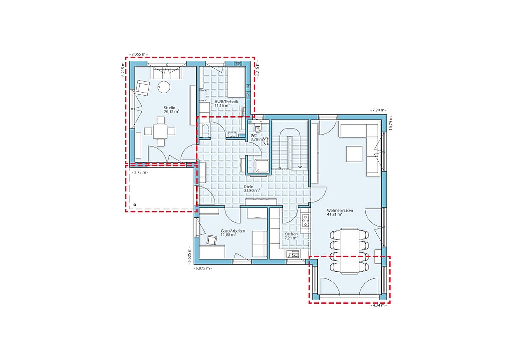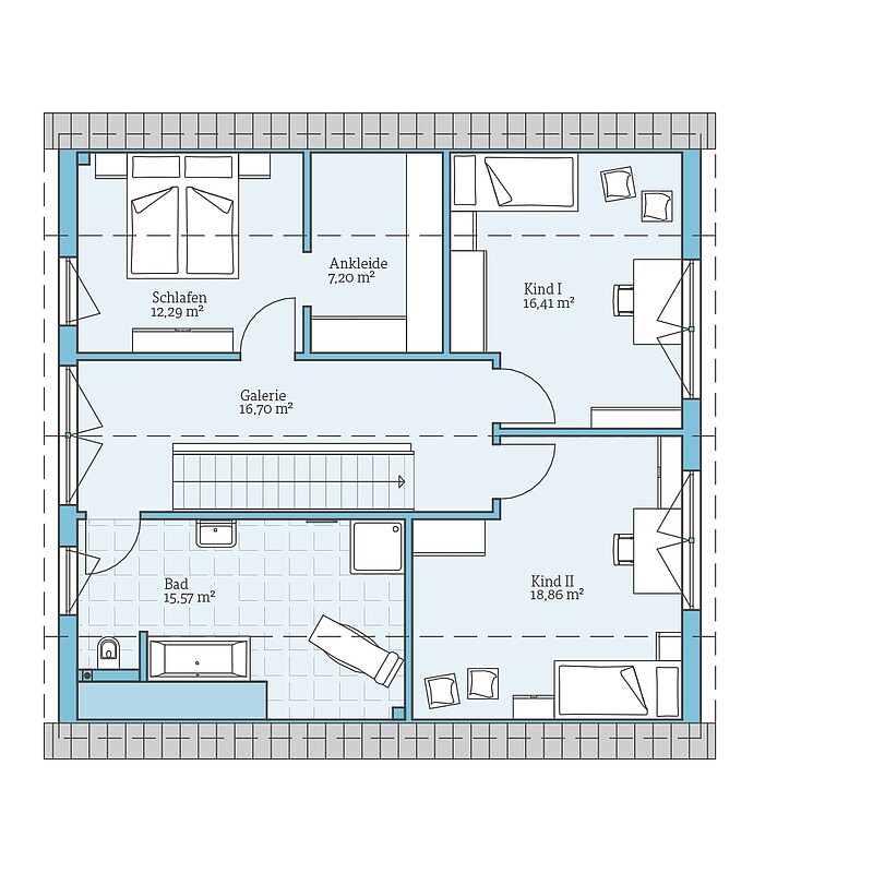 - Spielen Ihre Kinder eher in ihrem eigenen Zimmer? Planen Sie die Größe der Zimmer entsprechend. Schaffen Sie alternativ Spielzimmer oder planen Sie genügend Platz in Fluren oder Galerien ein.