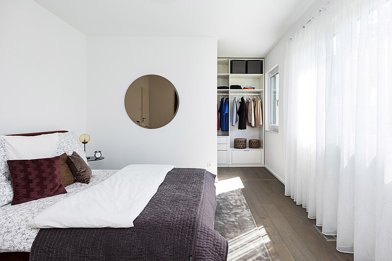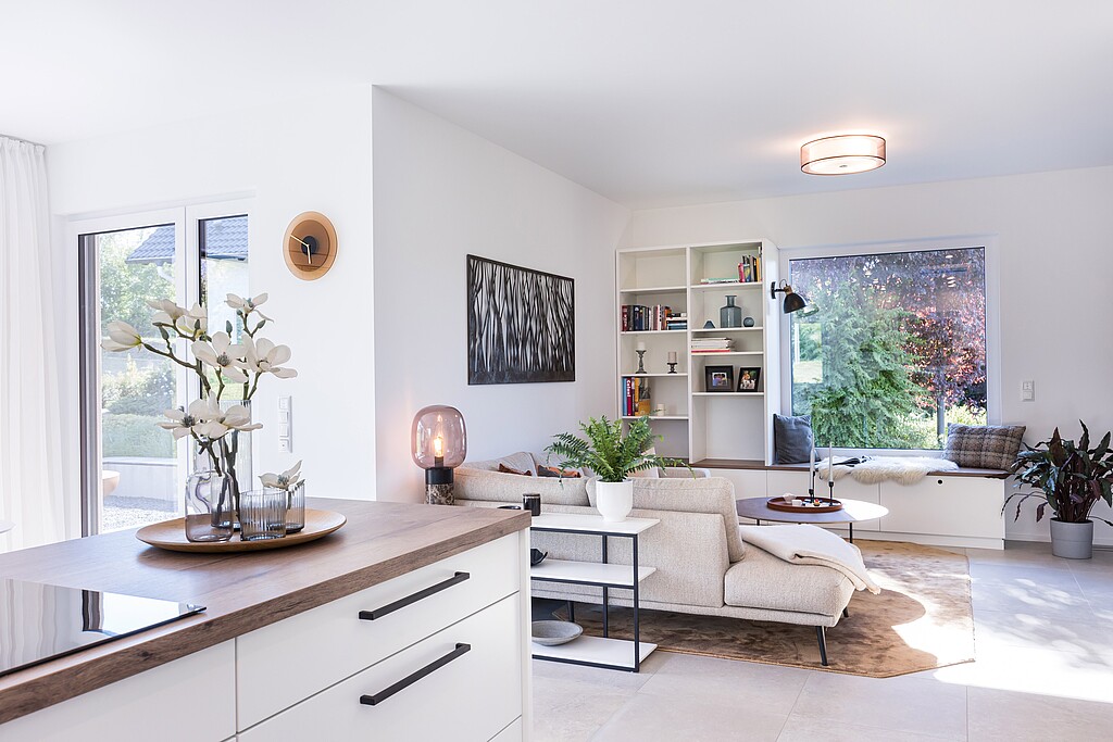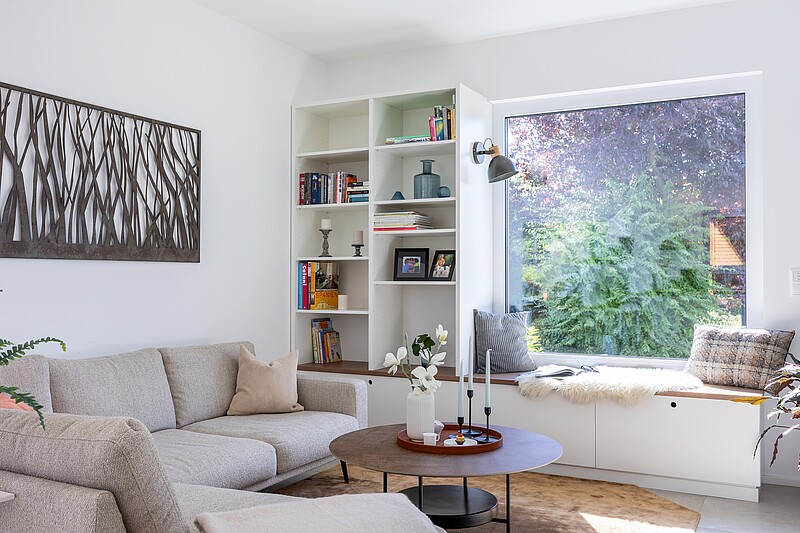 Der überdachte Freisitz mit Holzverschalung und der Fenstersitz im Wohnzimmer schaffen ein tolles Raumgefühl. Mit der Luft-Wasser-Wärmepumpe und einer Photovoltaikanlage erreicht das Musterhaus den KfW-Standard 40 Plus.
