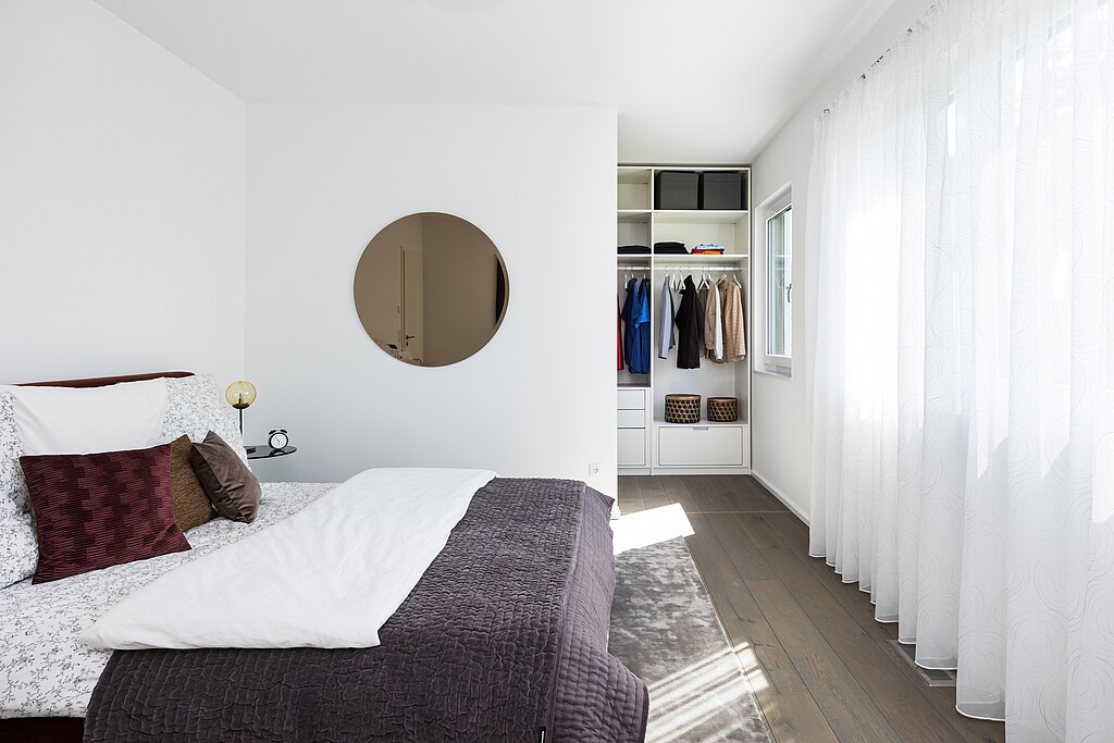 Im Flachdach-Anbau an der Eingangsseite des Hauses befindet sich ein Beratungsbüro, welches auch als zusätzliches Schlafzimmer genutzt werden kann. Es ist aber auch möglich, den Anbau als Garage zu planen. So gelangt man von dort aus trockenen Fußes in das angrenzende Wohnhaus.