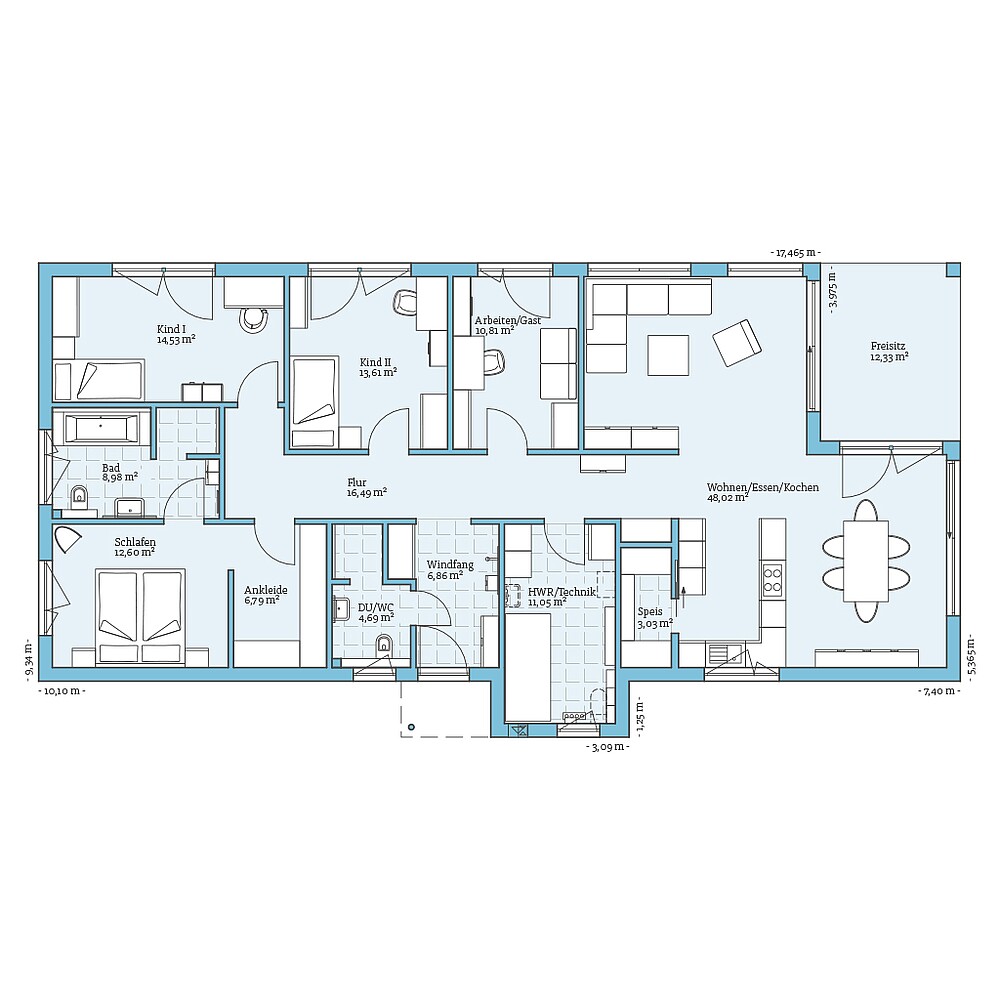 Der Hausentwurf Bungalow 169 bietet auf einer Ebene alles, was man zum Wohlfühlen braucht. Der Grundriss ist so gestaltet, dass alle Nebenräume in Richtung der Straße ausgerichtet sind. Die Wohnräume, in denen man sich oft aufhält, sind mit bodentiefen Fensterelementen ausgestattet und so angeordnet, dass man von dort aus direkt in den Garten blickt. Das natürliche Tageslicht und der Blick ins Grüne schaffen eine ganz besondere Wohnatmosphäre.