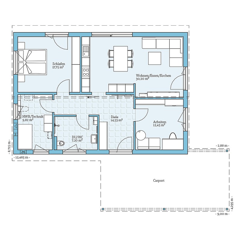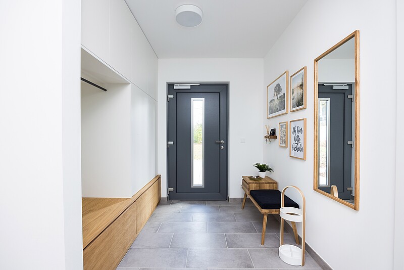 Der Bungalow 92 ist so kompakt geplant, dass er bereits auf Grundstücken ab 300 m² realisiert werden kann. Das versetzte Pultdach verleiht dem Bungalow eine moderne Optik und lässt sich hervorragend mit einem abgeschleppten Carport kombinieren. So ist der Hauseingang vor Regen geschützt und man gelangt trockenen Fußes vom Auto zum Haus.
