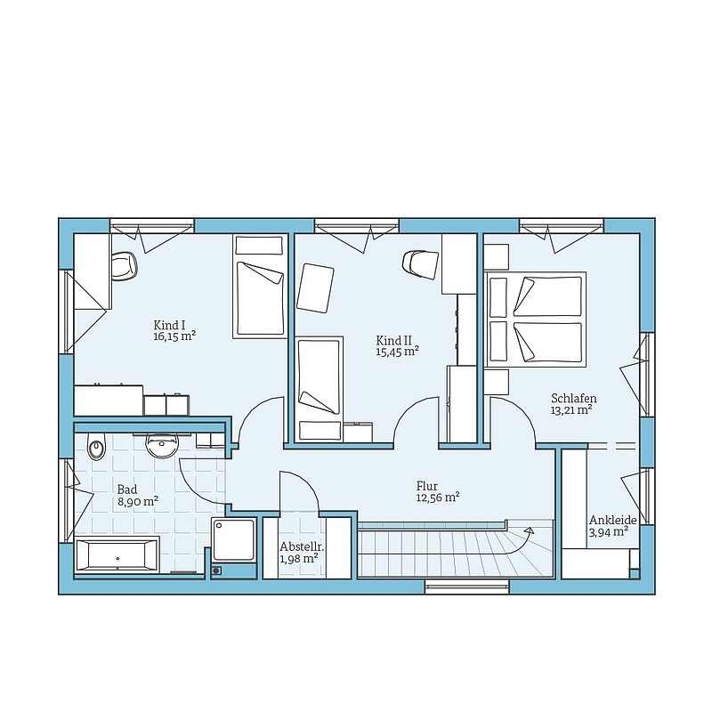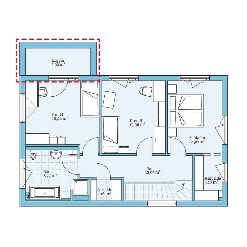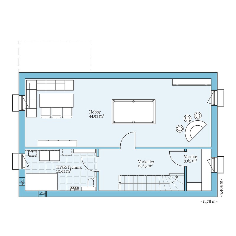 - Kellerabgang (statt Hauswirtschaftsraum/Technik im EG)