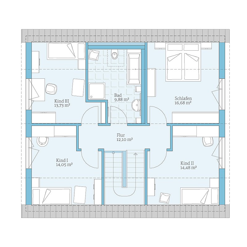 Im Obergeschoss, unter dem 35° geneigten Dach und einem Kniestock von 120 cm, befinden sich drei Kinderzimmer und das Elternschlafzimmer. Große, optional bodentiefe Fenster sorgen für lichtdurchflutete Räume und verstärken das Gefühl von Weite, während der durchdachte Grundriss eine optimale Raumnutzung ermöglicht.