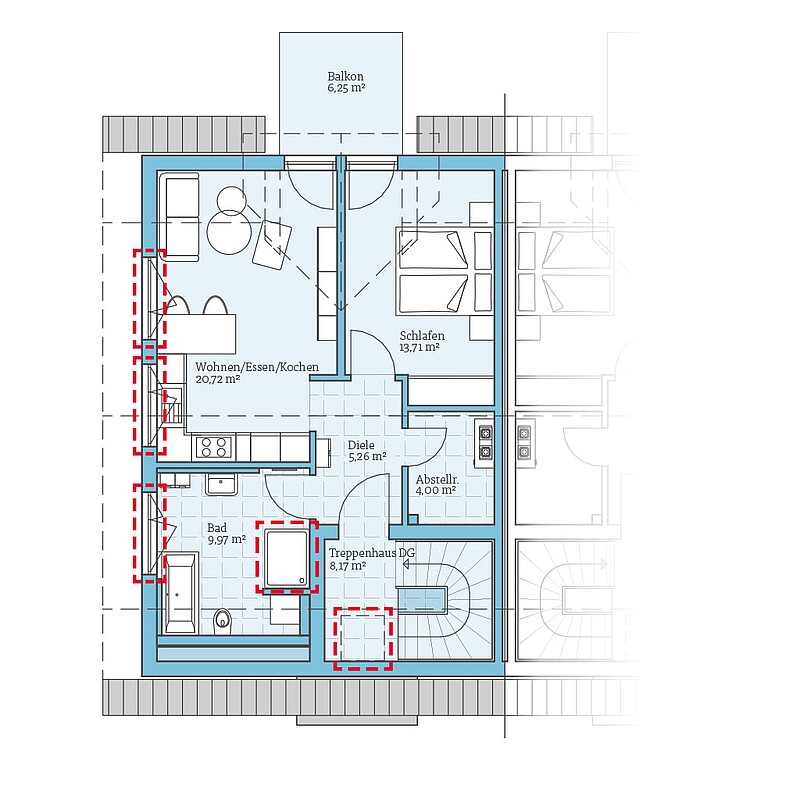 Unten sorgen ein Wohn-, Ess- und Kochbereich, Schlafzimmer, Duschbad und Technikraum für eine funktionale Basis. Oben sorgen Gauben für mehr Raum und Licht. Der Balkon ist vom Wohn- und Schlafzimmer aus erreichbar. Ein Bad mit Wanne und Dusche sowie ein Abstellraum runden die Wohnung ab.