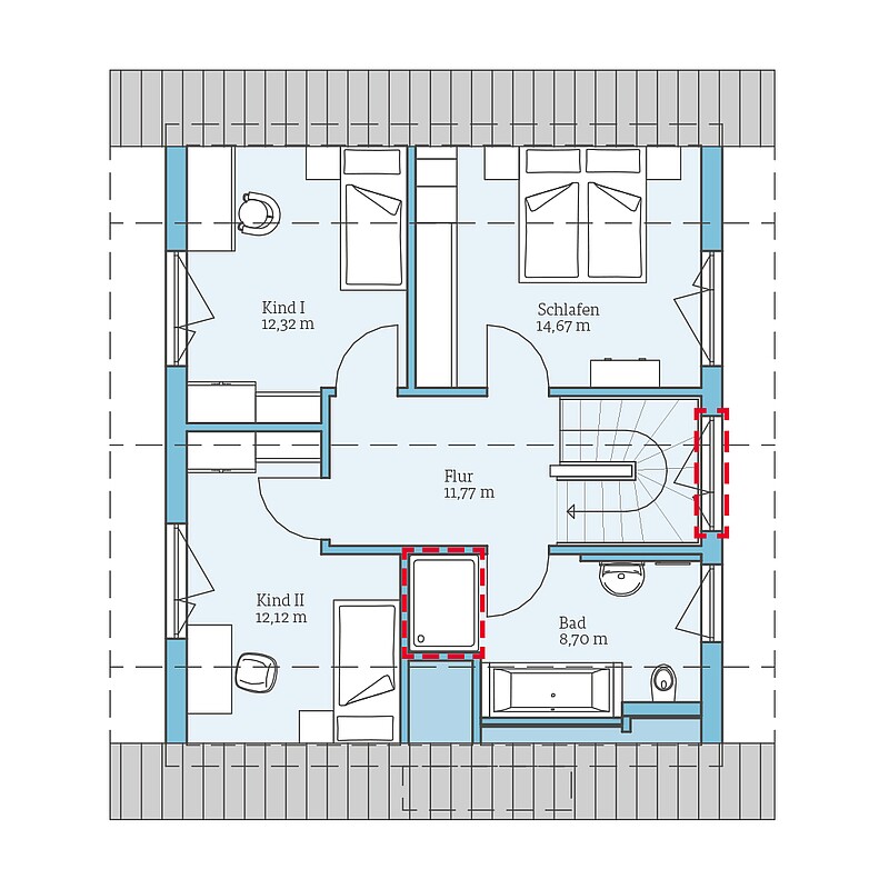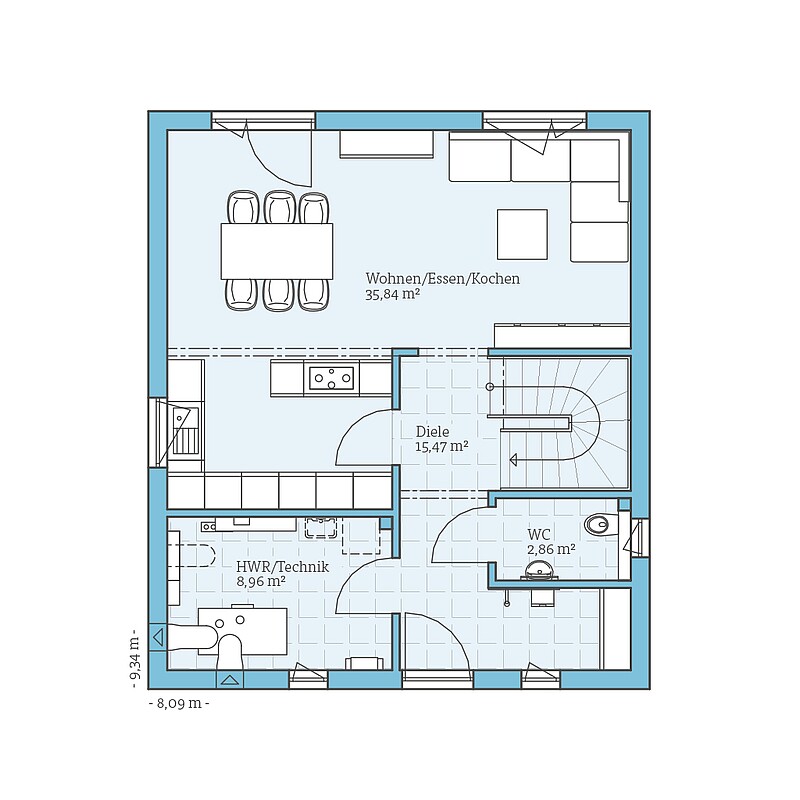 Im Erdgeschoss stehen 36 m² zum gemeinsamen Kochen, Essen und Entspannen zur Verfügung. Im Dachgeschoss sind alle Räume um einen sogenannten Verteilerflur herum angeordnet – eine besonders praktische und platzsparende Lösung mit möglichst wenig Verkehrsfläche.