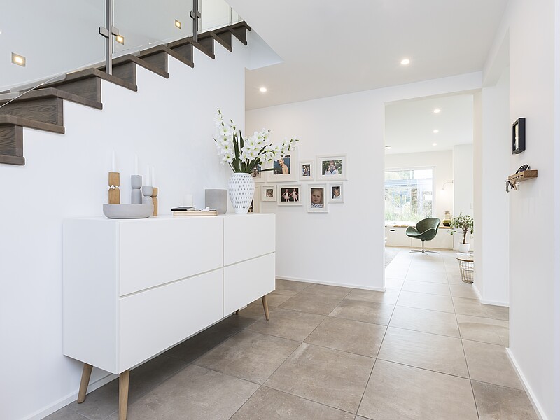 Ein grundsätzlicher Unterschied bei Reihenhäusern ist, ob sie in einer geraden Reihe angeordnet werden oder versetzt stehen. So wird das Reihenhaus optimal an die Form der Grundstücke und die Ausrichtung der Straße angepasst. Mit ihren knapp 120 Quadratmetern können die Häuser jeweils bereits auf kleinen Grundstücken ab 300 Quadratmetern umgesetzt werden.