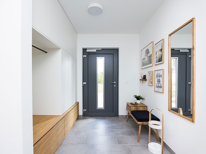 Man betritt das Tiny House mit 44 Quadratmetern Wohnfläche über den eingeschossigen Teil des Hauses, in dem auch das Badezimmer und der Technik- und Hauswirtschaftsraum untergebracht sind.