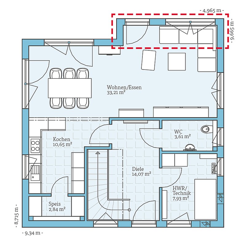 Der großzügige lichtdurchflutete Wohn-, Ess- und Kochbereich, ein separates Gäste-WC und das große Bad im Dachgeschoss bieten einen angenehmen Wohnkomfort und machen das Haus zum WohlfühlZuhause für eine bis zu vierköpfige Familie. Ein Hauswirtschafts-/Heiztechnikraum im Erdgeschoss macht es möglich, diesen Entwurf kostensparend ohne Keller zu bauen.