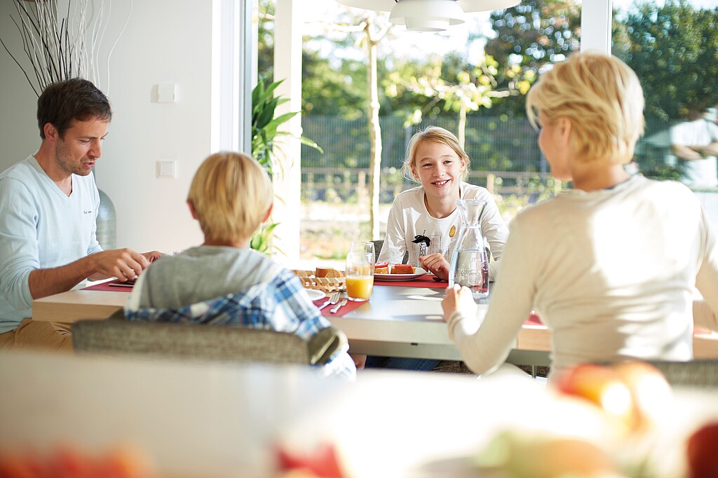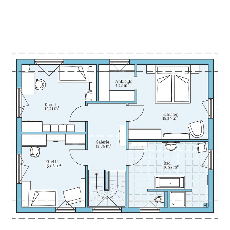 Im Grundriss ist ein giebelseitiger Eingang umgesetzt. Die Treppe liegt an der Traufseite. So ergibt sich ein offener Koch- und Wohnbereich. Über die geradlinige Galerie im Dachgeschoss erreicht man zwei Kinderzimmer, das Schlafzimmer und ein großzügiges Bad mit moderner T-Lösung.