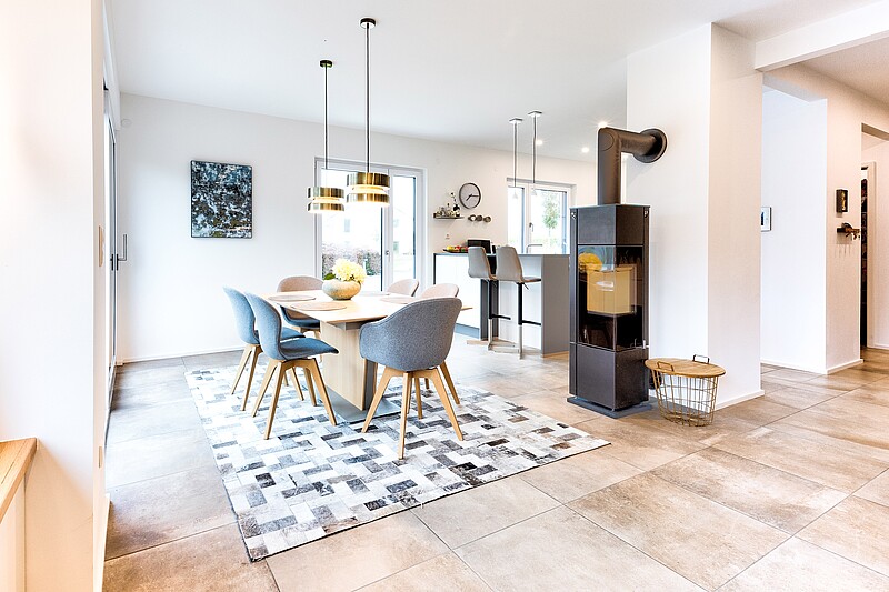 Reiner, weißer Putz strahlt in Kombination mit dunkel- und hellgrauen Farbflächen Stilsicherheit aus. Einen spannenden und dennoch ganz natürlichen Kontrast schafft die Sandsteinfassade am Zwerchgiebel. Große Glasflächen fangen das Tageslicht ein und lassen im Haus eine angenehme Wohlfühl-Atmosphäre entstehen.