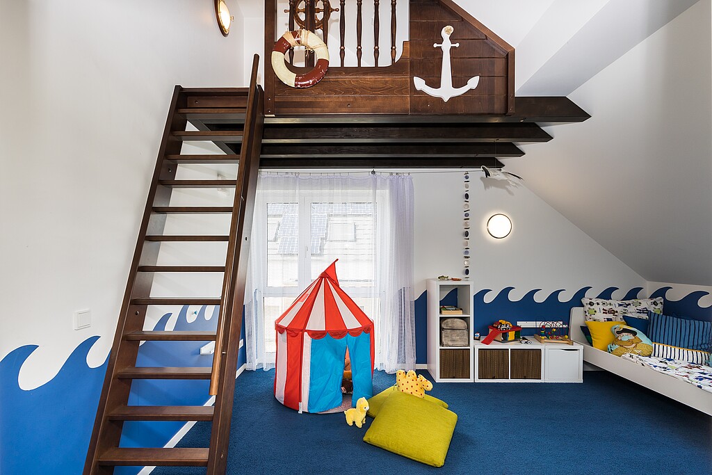 Diese Planungsvariante unseres Hausentwurfs Variant 35-235 bietet jede Menge Raum für große Familien: Ein separater Elternbereich mit großem Schlafzimmer, Wellnessbad und Ankleidezimmer ist im Erdgeschoss untergebracht, während das Dachgeschoss zu einem eigenen Reich für die Kinder wird. Dort ist neben vier Kinderzimmern noch genug Platz für ein Gästezimmer – und damit es zur morgendlichen Rushhour keinen Stau gibt, stehen für die Kinder gleich zwei Bäder zur Verfügung.