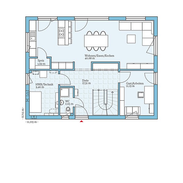 Wohn-, Ess- und Kochbereich; Speisekammer; Hauswirtschafts- und Technikraum; Diele; Gäste-WC mit Dusche; Arbeits- oder Gästezimmer