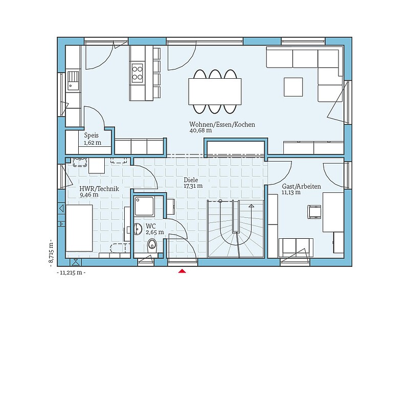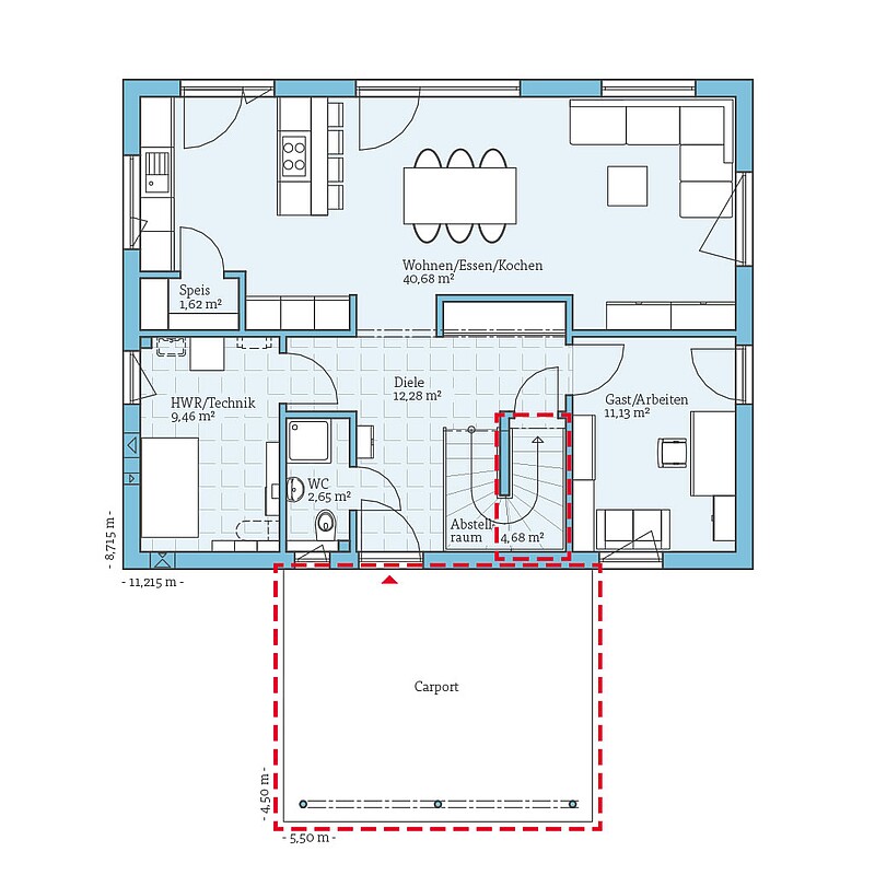 Wohn-, Ess- und Kochbereich; Speisekammer; Hauswirtschafts- und Technikraum; Diele; Gäste-WC mit Dusche; Arbeits- oder Gästezimmer; Carport