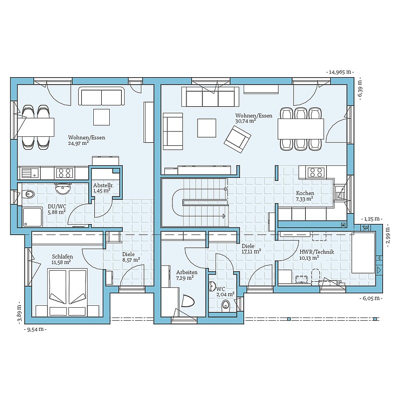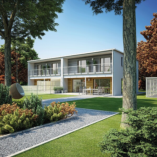 Ein Beispiel für ein Mehrfamilienhaus aus Holz ist unser Hausentwurf Duo 315: In dem modernen Holzfertighaus sind zwei etwa gleich große Wohneinheiten nebeneinander angeordnet.