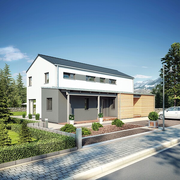 Wie individuell Doppelhäuser in Holzbauweise umgesetzt werden können, zeigt zum Beispiel unser Entwurf Doppelhaus 144: ein kubisch Flachdachhaus mit modernem Charakter.