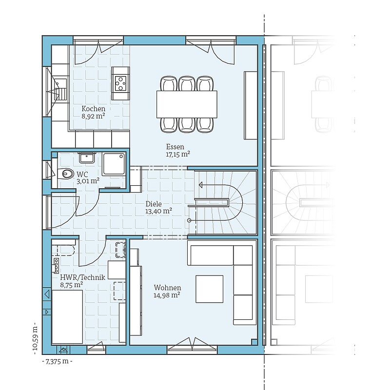 Bei unserem Vorschlagsentwurf Duo 210 ist die 44 m² große Einliegerwohnung in den Baukörper integriert und verfügt über einen separaten Hauseingang.