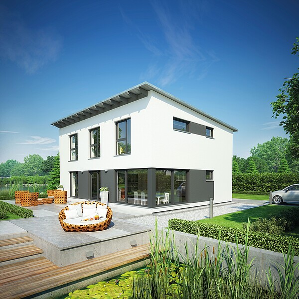 Wenn Sie sich nicht sicher sind ob Ihnen Häuser mit Walmdach gefallen oder ob Sie eher ein Haus mit einer anderen Dachform bevorzugen, können Sie sich unseren Haustyp Fertighaus Villa anschauen, dessen Dach entweder ein Walmdach oder Zeltdach ist.