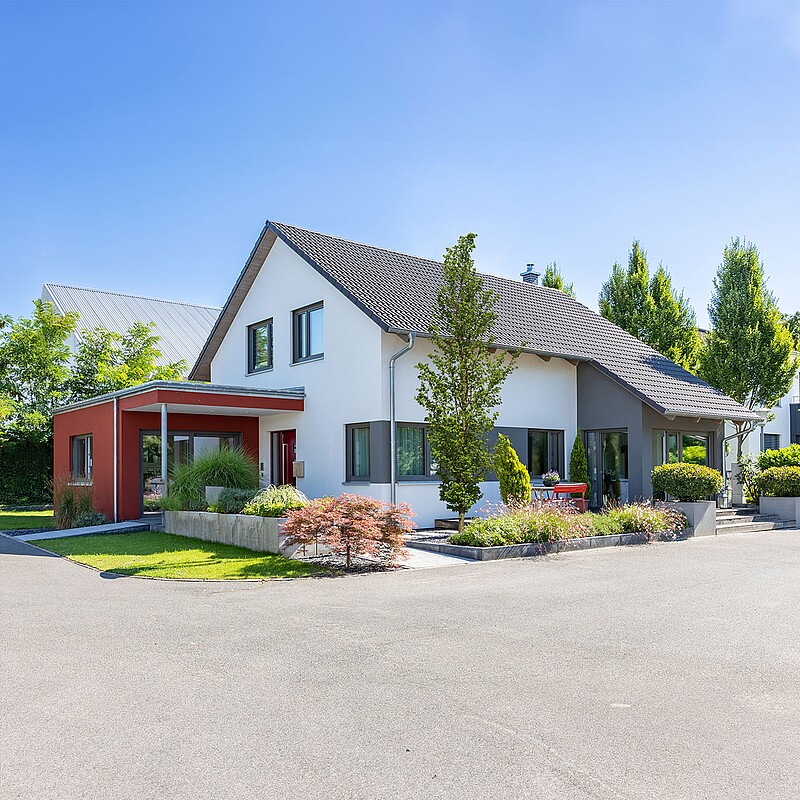 Mit seinem cleveren Grundriss bietet unser Musterhaus auf rund 182 m² Wohnfläche viel Platz für das tägliche Familienleben. Ein optisches Highight ist die leuchtend rote Haustür.