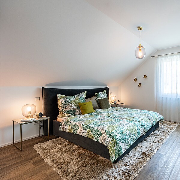 Der offene Wohn-, Ess- und Kochbereich wird durch einen großflächig verglasten Erker erweitert, der dort eine ganz besondere Atmosphäre schafft und ein Stück Natur ins Haus holt. Ein Stockwerk höher befinden sich das Bad und die Schlafräume – ganz gemütlich unter Dachschrägen.