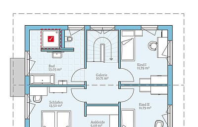 Standard-Badezimmer im ObergeschossWir möchten das Badezimmer so planen, wie es im Standard-Grundriss vorgesehen ist. -