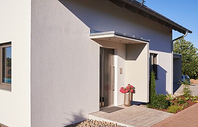 Wie wäre es mit einem Haustürvordach oder einem Haustür-Seitenteil für Ihr Fertighaus? Es schützt den Hauseingang vor Regen, während es gleichzeitig zu einem optischen Highlight wird. Die Bilder dienen der Veranschaulichung.