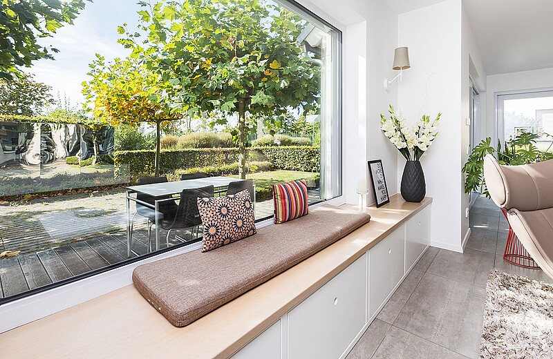 Sie planen Ihr Haus auf einem Grundstück mit schöner Aussicht auf die Berge, einen See oder Ihren Garten? Nutzen Sie diesen Luxus und statten Sie Ihr Haus mit einem Fenster mit Sitzbank aus. So entsteht ein ganz besonderer Platz zum Lesen, Entspannen und Träumen.