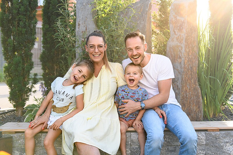 In ihrem Garten haben sie sich eine eigene Wohlfühloase geschaffen, in der die Kinder genug Platz zum Spielen haben, während sich die Eltern in der Sonne entspannen können.