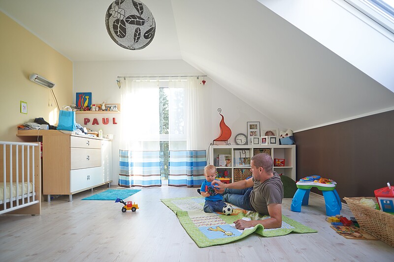 Zwei große Kinderzimmer und das Wellness-Bad mit Dusche und Badewanne komplettieren das Dachgeschoss.