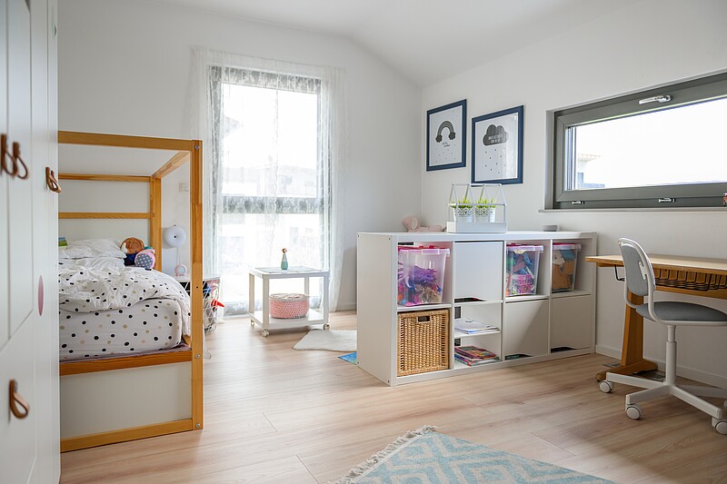 Ein großzügiger Wohn- und Essbereich mit offener Küche sorgt dafür, dass genug Platz für das tägliche Familienleben zur Verfügung steht. Im geräumigen Obergeschoss mit zwei Kinderzimmern und einem Elternbereich findet jedes Familienmitglied seinen Rückzugsort zum Entspannen.