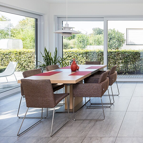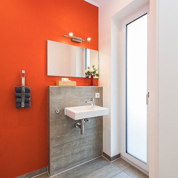 Unser modernes Musterhaus vereint Wohnen und Arbeiten unter einem Dach. Der Arbeitsbereich mit separatem Eingang und WC eignet sich perfekt, um dort ein Büro, einen Salon oder eine Praxis zu verwirklichen.