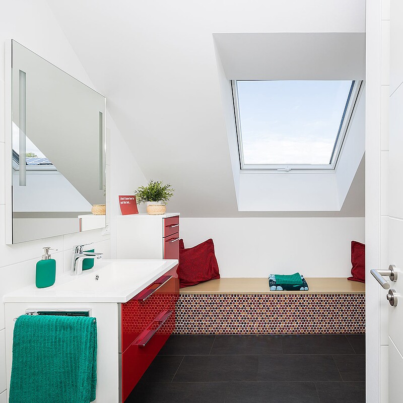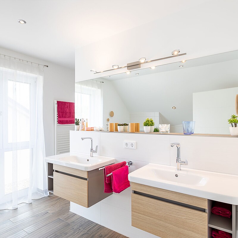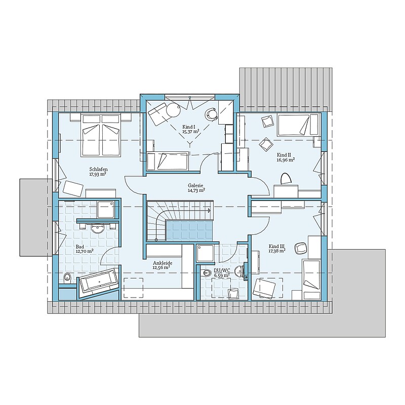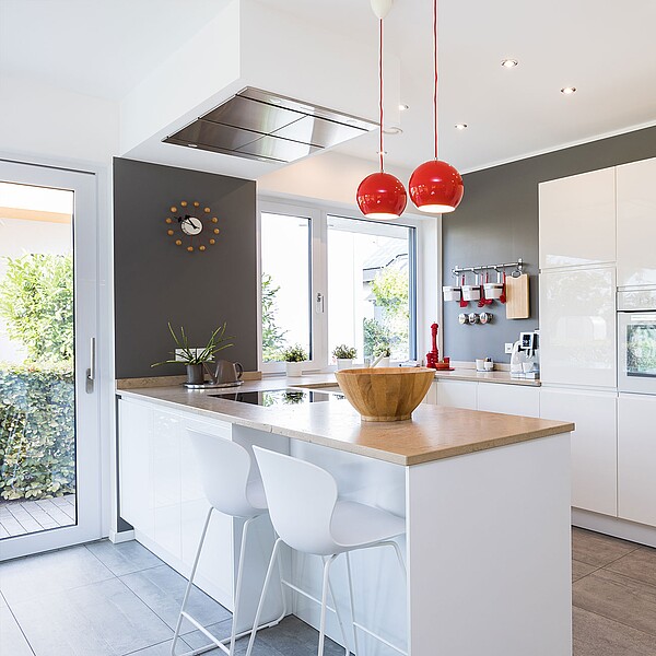 Unser Musterhaus mit 221 m² Wohnfläche ist optimal auf den Alltag einer fünfköpfigen Familie zugeschnitten: Im hellen Wohn-, Ess- und Kochbereich stehen 46 m² zur Verfügung und im Dachgeschoss entsteht durch den Zwerchgiebel Platz für drei Kinderzimmer mit eigenem Bad.