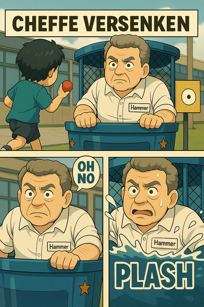* Beim sogenannten Easy-Dunker sitzt eine Person auf einer Bank über einem Wasserbecken. Wer mit einem Ball ins Schwarze trifft, sorgt dafür, dass der oder die Sitzende ins Wasser fällt – zur großen Freude aller Zuschauer.