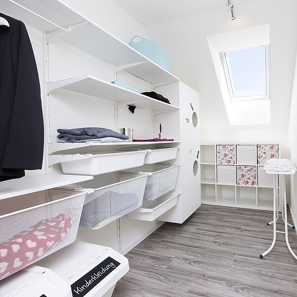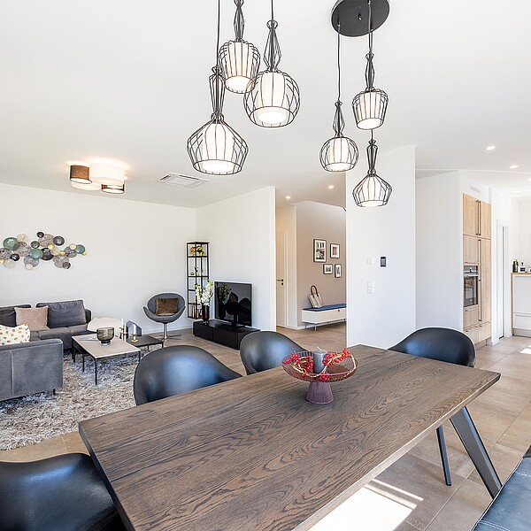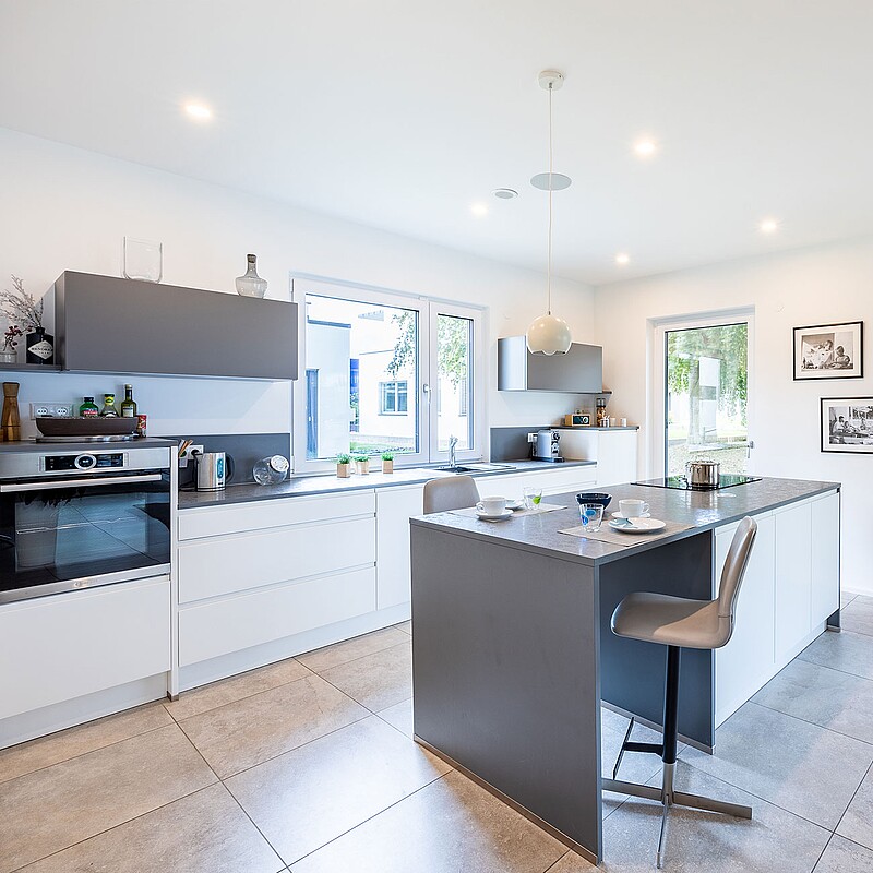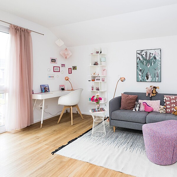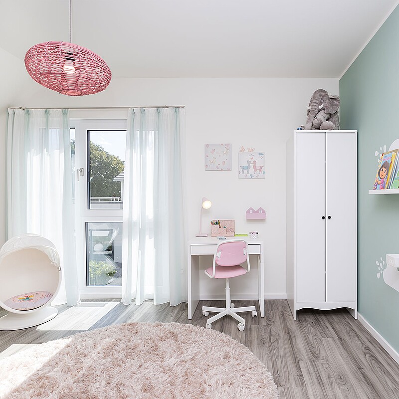 Highlight des Musterhauses ist der offene, lichtdurchflutete Wohn-, Ess- und Kochbereich, der mit seinen rund 55 m² zum Mittelpunkt des täglichen Familienlebens wird. Die Kinderzimmer sind so dimensioniert, dass sich der Nachwuchs bis ins Jugendalter wohlfühlt.