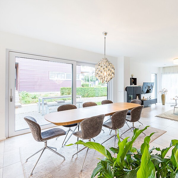 Unser Musterhaus zeigt, wie der Essbereich mit einer überdachten Terrasse erweitert werden kann. Außerdem verfügt es über einen Anbau mit Flachdach, der sich ganz flexibel als Garage, Büro oder auch als Einliegerwohnung nutzen lässt.