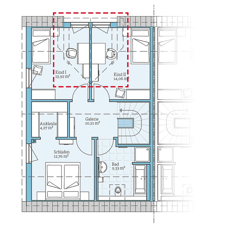 Die Grundrisse der Doppelhaushälten sind identisch und bieten Platz für die ganze Familie. Die Zwerchgiebel sorgen für noch mehr Raum und Tageslicht unter dem Dach und lockern gleichzeitig die Außenansicht der versetzt platzierten Haushäften auf.