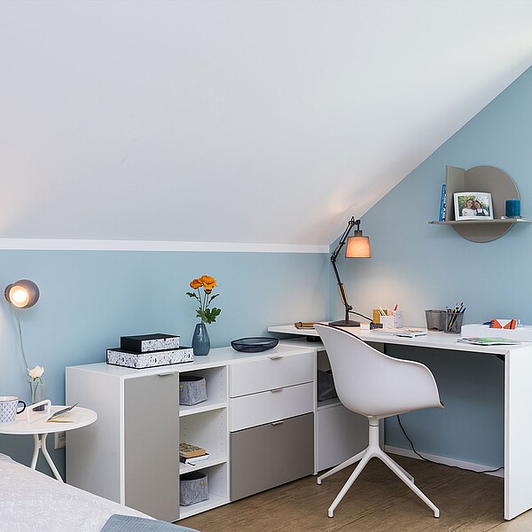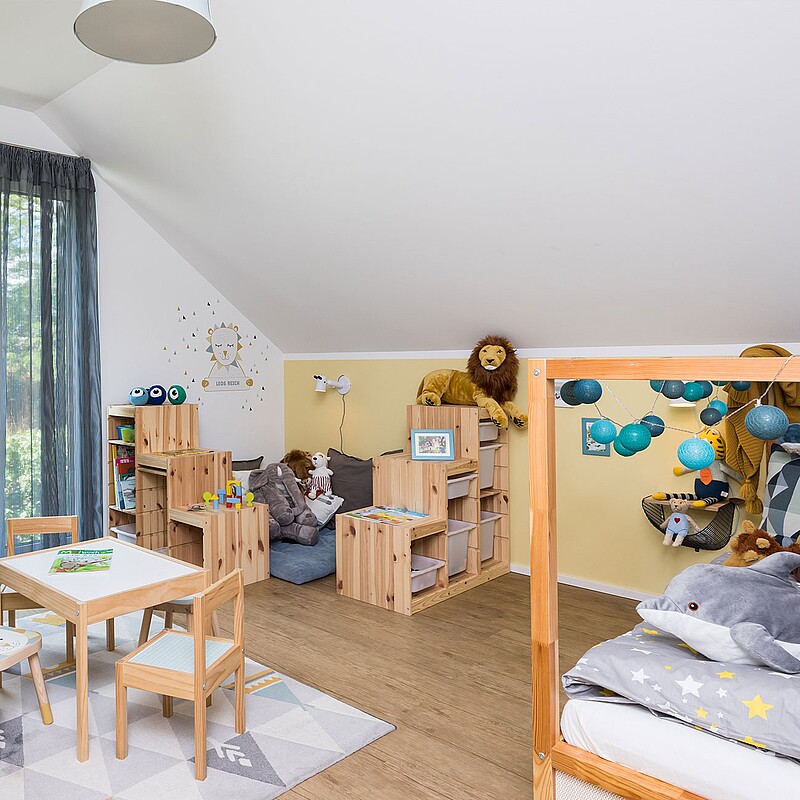Mit seinem hohen Kniestock verfügt das Einfamilienhaus über ein geräumiges Dachgeschoss. Neben dem Schlafzimmer mit Ankleide und Wellnessbad finden dort zwei Kinderzimmer Platz, die so dimensioniert sind, dass sich der Nachwuchs bis ins Jugendalter wohlfühlt.
