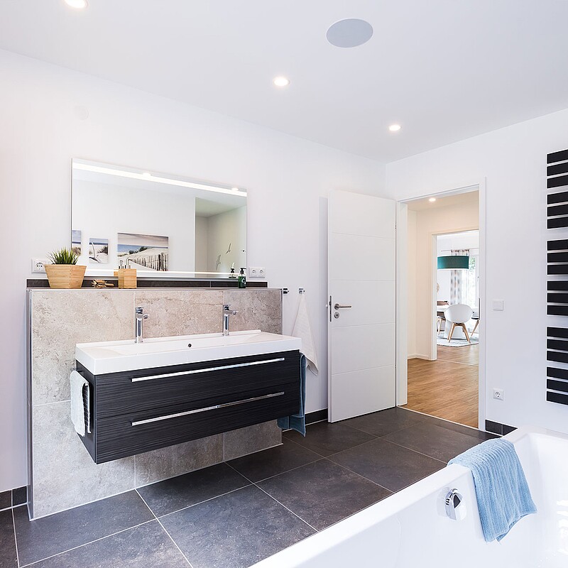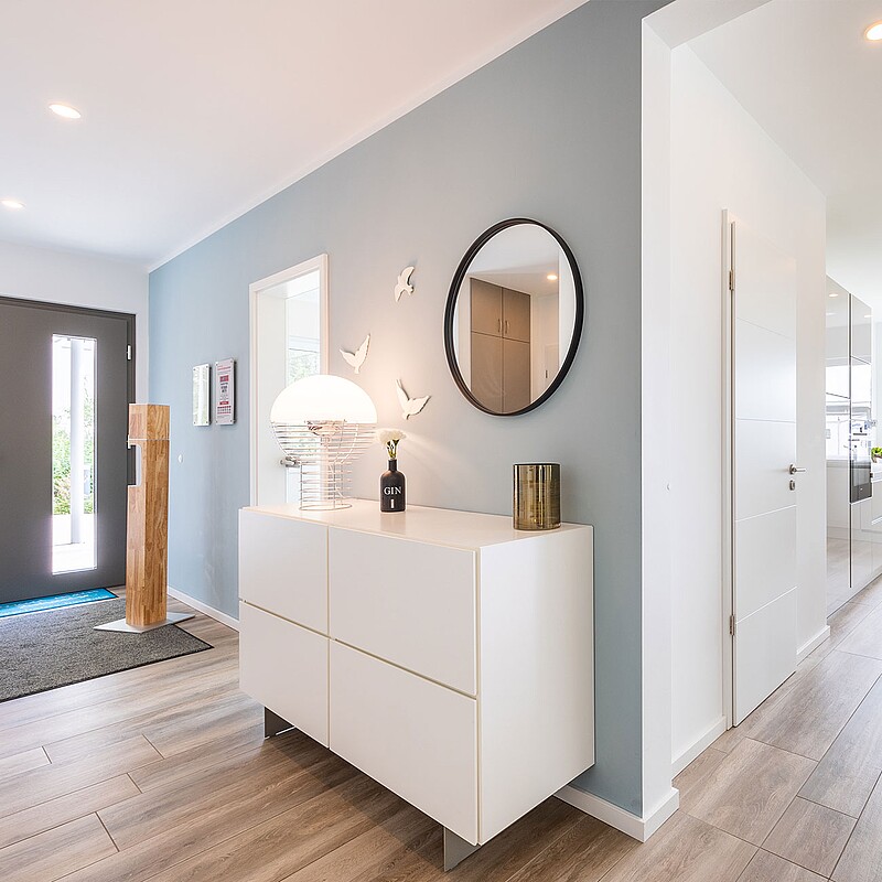 Heller Wohnraum ganz ohne Dachschrägen – erleben Sie in unserem Musterhaus die Vorteile eines Hauses mit zwei Vollgeschossen. Auf 179 m² Wohnfläche bietet das Einfamilienhaus mit Walmdach viel Platz zum Wohlfühlen.