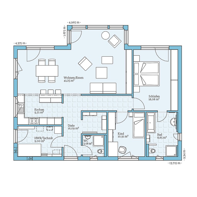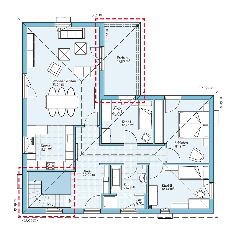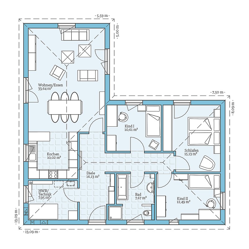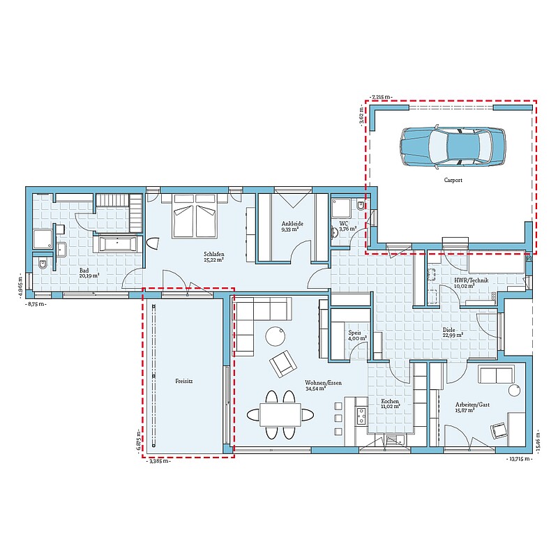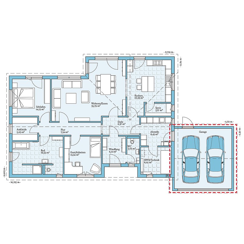 It's not always easy to find the perfect floor plan for yourself. That's why we have designed a variety of suggested layouts for you. But of course we plan your home according to your wishes and needs. The list of floor plans is sorted in ascending order of overall size.