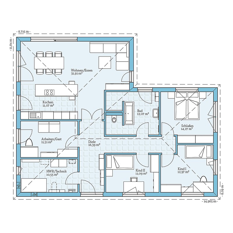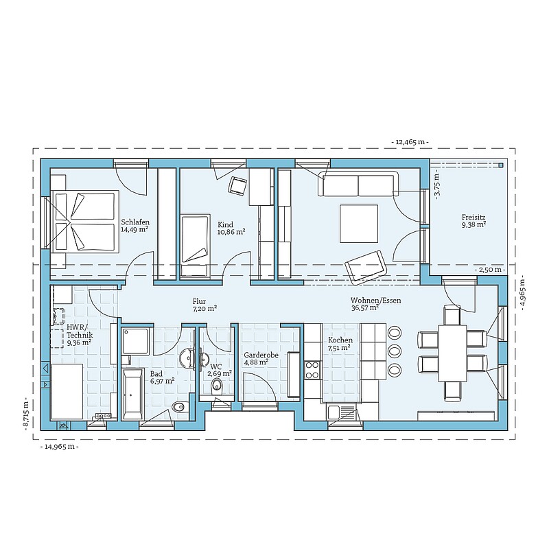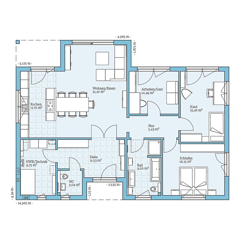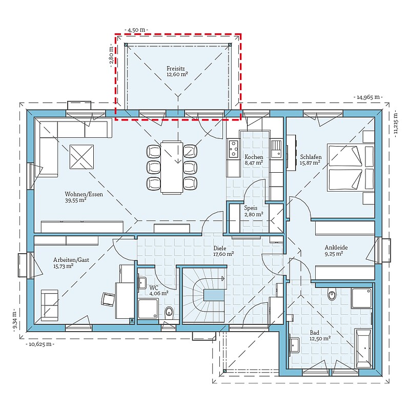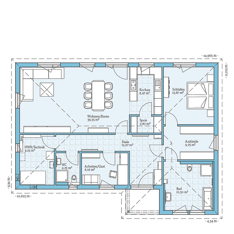 In a bungalow, all rooms are located on one level, so this type of house differs from multi-storey houses in terms of the floor plan. Nevertheless, our eleven tips for the perfect floor plan also apply here.