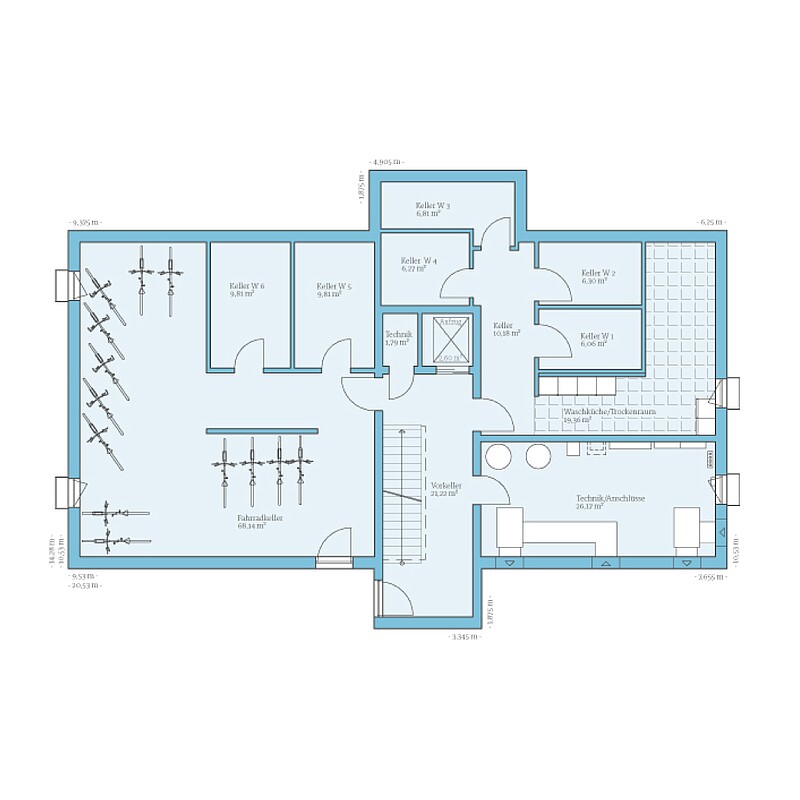 Residents can use the lift in the stairwell to reach the basement. From the bicycle cellar, where walking aids, street wheelchairs or pushchairs can also be parked, for example, an external staircase with ramp leads directly outside. The communal laundry and drying room banishes the washing machine, tumble dryer and annoying clothes horse from the flat, creating more space for living.