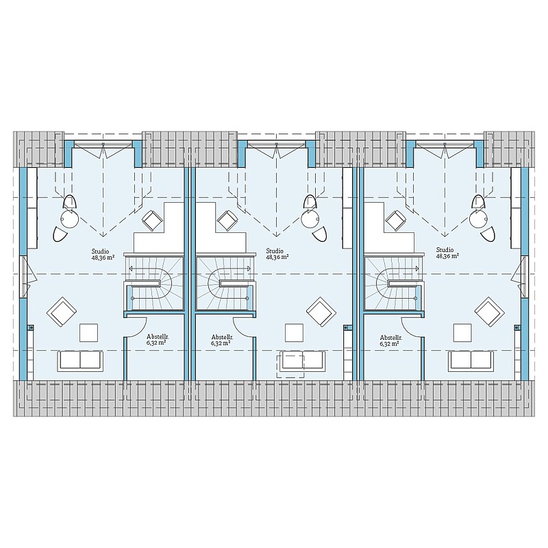 In this planning variant of the Terraced 118, the pitch of the gable roof has been increased and a dwarf gable has been added to the garden side. This creates an additional storey with recreation rooms and versatile uses. The dwarf gable provides headroom and its large window surfaces allow in plenty of light to another children’s bedroom, a guest room and study or a fitness and hobby room, as well as additional storage space up to the level of the slanting roof slopes.