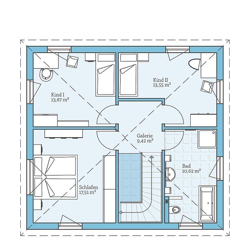 The children’s rooms and master bedroom are situated on the upper floor. The wellness bathroom ensures a fresh start to the day in the morning and restful relaxation in the evening.
