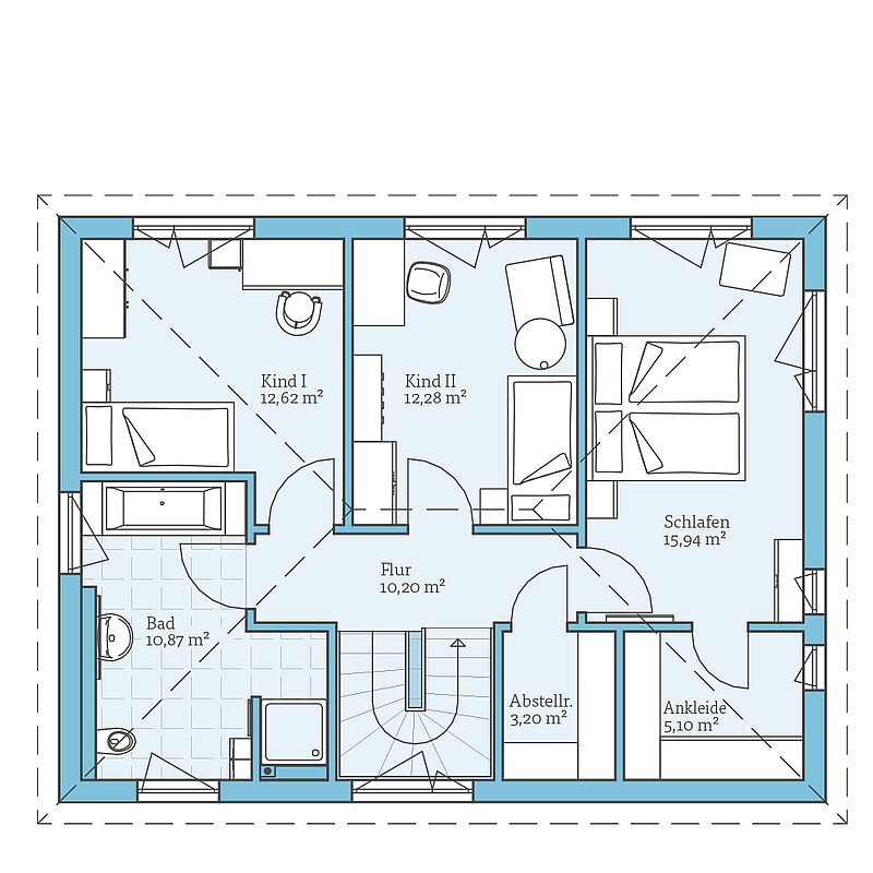 The clever planning of the Villa 142 makes it possible for 142 m² to accommodate not only comfortable living space and a separate room for each member of the family but also a large dressing room for the parents and a study or guest room.