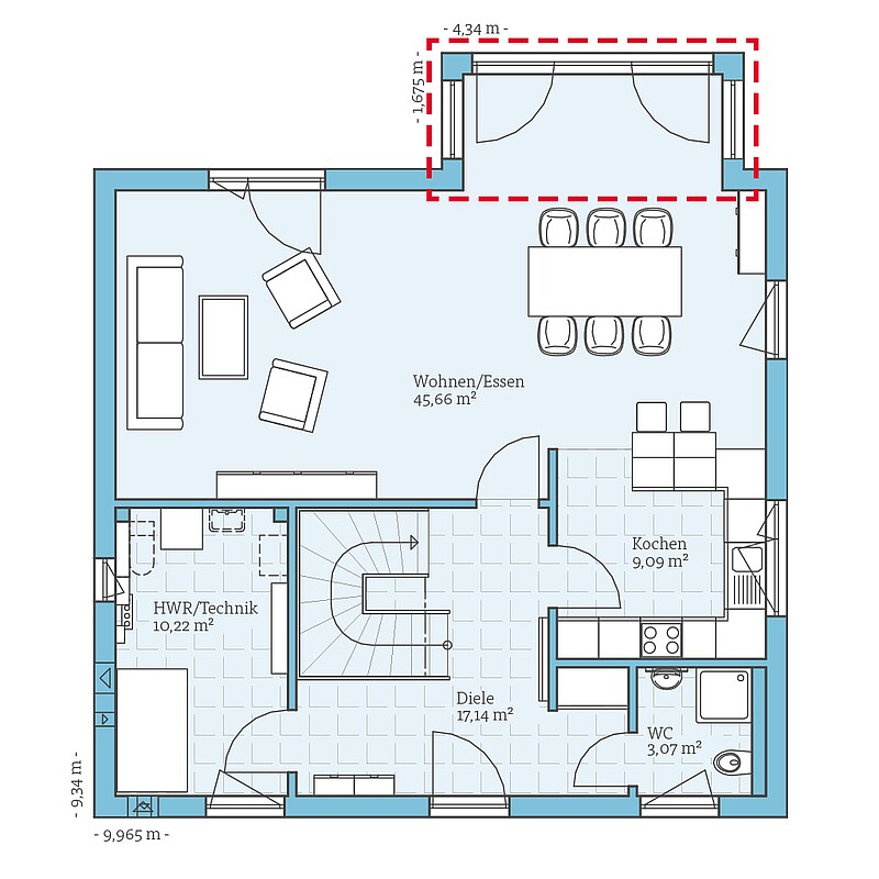 This model, with a generous 156 m², can be enlarged on request, for example, with a glass conservatory and overlying loggia or with one of the many other extensions of the Villa series. So that the Villa 156 becomes a house built the way you want it.