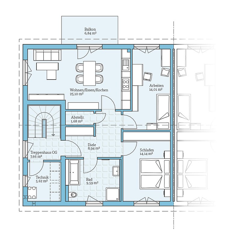 Jede Wohnung überzeugt mit offener Wohnstruktur, separatem Arbeitszimmer, Schlafzimmer, Bad mit Wanne und Dusche sowie Technik- und Abstellraum.