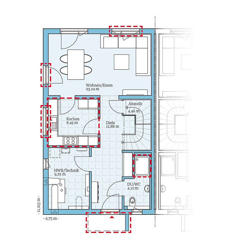 - Größere Fenster im Wohn-, Ess- und Kochbereich